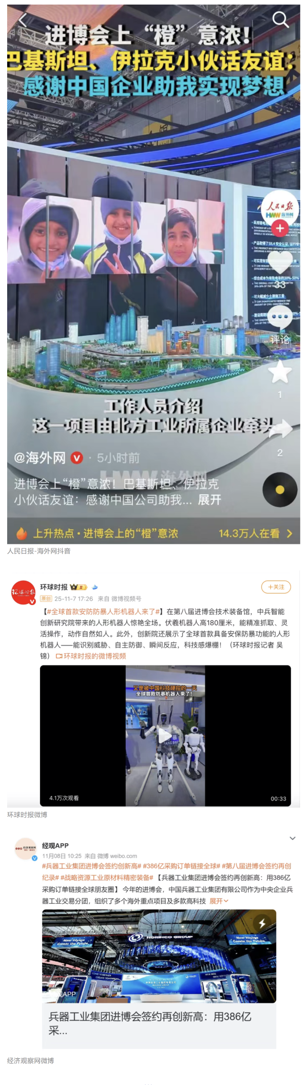 11月5日至10日,中國兵器工業(yè)集團(tuán)有限公司組團(tuán)參加第八屆中國國際進(jìn)口博覽會(huì)。集團(tuán)公司以“堅(jiān)持合作共贏,推進(jìn)高水平對外開放,助力構(gòu)建新發(fā)展格局”為目標(biāo),圍繞“新征程,共創(chuàng)未來”主題組團(tuán)參展,集中展示了一系列新技術(shù)、新理念、新成果,取得豐碩成果,受到廣泛關(guān)注。 嘉賓云集 本屆進(jìn)博會(huì)上,蒙古國駐華大使、贊比亞礦業(yè)和礦產(chǎn)開發(fā)部常任秘書、津巴布韋首席司長等多國政要蒞臨集團(tuán)公司組展展區(qū),了解有關(guān)項(xiàng)目情況。 國家能源集團(tuán)、東風(fēng)汽車、哈電集團(tuán)、鞍鋼集團(tuán)、中鋁集團(tuán)、通用技術(shù)集團(tuán)、中國中車、中國長安汽車、中國電建等央企領(lǐng)導(dǎo),工信部、國務(wù)院國資委、中國貿(mào)促會(huì)、陜西省、上海市、浙江省等國內(nèi)政府部門領(lǐng)導(dǎo)以及國內(nèi)外合作伙伴蒞臨集團(tuán)公司組展展區(qū)參觀指導(dǎo)。對集團(tuán)公司高質(zhì)量共建“一帶一路”,與各國合作伙伴共享發(fā)展機(jī)遇、實(shí)現(xiàn)互利共贏給予高度評價(jià)。 媒體關(guān)注 集團(tuán)公司集中簽約亮相央視綜合頻道《新聞聯(lián)播》、央視新聞?lì)l道《朝聞天下》《新聞30分》《共同關(guān)注》、央視財(cái)經(jīng)頻道《正點(diǎn)財(cái)經(jīng)》《經(jīng)濟(jì)信息聯(lián)播》。 《環(huán)球時(shí)報(bào)》、環(huán)球網(wǎng)、《新京報(bào)》、《中國旅游報(bào)》等對集團(tuán)公司人形機(jī)器人、四足機(jī)器人、涵道穿戴式載人飛行器、外骨骼等多型新域新質(zhì)產(chǎn)品,集中亮相進(jìn)行報(bào)道。新華社、央廣中國之聲、新京報(bào)(貝殼財(cái)經(jīng))、上海廣播電視臺等媒體直播探館,打卡兵器“硬核科技”。 人民日報(bào)客戶端、新華社客戶端、人民網(wǎng)、中國網(wǎng)、中國日報(bào)網(wǎng)、國務(wù)院國資委網(wǎng)站、國資小新微信公眾號、國資小新Facebook、學(xué)習(xí)強(qiáng)國中央企業(yè)學(xué)習(xí)平臺、經(jīng)濟(jì)觀察網(wǎng)、新京報(bào)客戶端等第一時(shí)間刊發(fā)集團(tuán)公司組展簽約、ESG建設(shè)等情況。新浪財(cái)經(jīng)、界面新聞等商業(yè)平臺閱讀量累計(jì)超500萬次。 在微博、抖音等新媒體平臺上,集團(tuán)公司高科技產(chǎn)品演示、5D穹幕電影體驗(yàn)等短視頻持續(xù)引爆流量,累計(jì)播放量超800萬次,點(diǎn)贊量破50萬。“兵器工業(yè)集團(tuán)進(jìn)博會(huì)簽約386億”相關(guān)話題登上微博熱搜榜,閱讀量破5000萬次。 文字丨劉暢 |